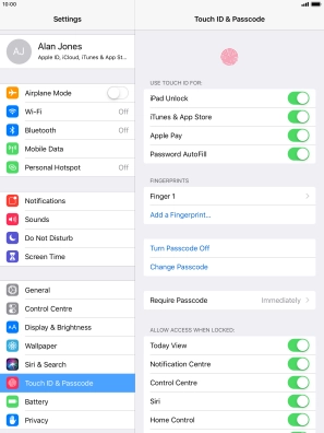You can set your tablet to use your fingerprint as lock code or to authorise iTunes and App Store purchases. To use Touch ID, you need to turn on the lock code.