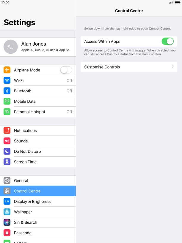 Using Control Centre, you can get quick access to selected functions on your tablet.