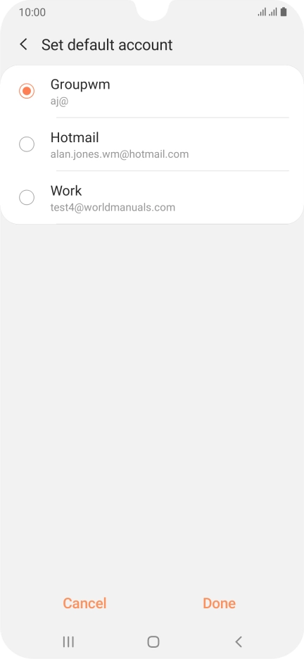 If you've set up more than one email account on your mobile phone, you can select a default email account. When you send an email from one of your mobile phone's applications, the default account will be used unless you're asked to select an account before sending the email.